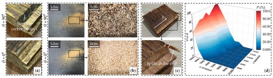 During the milling tests of recombinant bamboo, we observed surface carbonization and end splitting as common defects, specifically occurring at θ = 90°. These defects negatively impact the aesthetic and ornamental properties of recombinant bamboo. To further investigate the causes of these machining defects, we conducted an extended milling test using 640 specimens with θ = 90°. The spindle speed n ranged from 3000 r/min to 10,000 r/min, and the feed speed v ranged from 450 mm/min to 1500 mm/min. The test results are presented in Figure 5. Additionally, each set of machining parameters was repeated ten times to calculate the probability of splitting occurrence P. The calculated probabilities are given in Table 5 and Figure 5d.