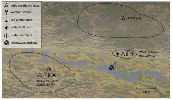 We considered three contrasting sites where the eddy-covariance (EC) masts were located: the ridge-hollow complex (RH), the waterlogged hollow (WH), and the ryam (RY). These sites represent typical landscape types within the Mukhrino peatland.