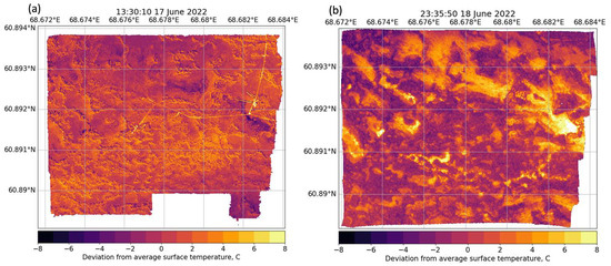 37] also reported substantial surface temperature contrasts between hollows and hummocks over a peatland in Finland using thermal images obtained from a UAV. However, the study focused on identifying turbulent structures in the fast-evolving surface temperature fields. The UAV thermal mapping over a hummock-hollow peatland landscape in Sweden also showed strong spatial contrasts of surface temperature in individual orthomosaics, especially in the hot and dry summer of 2018 [