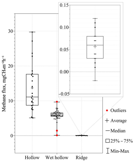 11]. These microlandscapes differ by topography, water table level, physical properties of the surface and soil, and vegetation. As a result, spatial contrasts arise in the surface and soil temperatures and in the components of the surface heat and moisture budgets. These differences affect methane emissions, especially temperature and water-table level, and thus also demonstrate strong spatial variability [