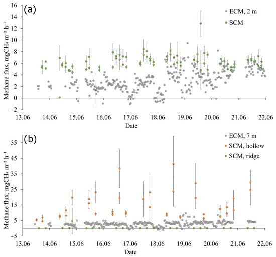 Figure 13b). Namely, the methane flux obtained using SCM over the hollow is several times larger than the ECM methane flux. One of the reasons is clearly the heterogeneity of landscape within the footprint of the EC tower. A large fraction (roughly 40%–50%) of the footprint area is covered by ridges (