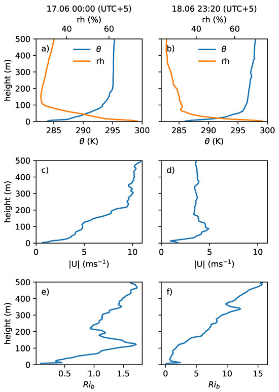 Figure 15 shows the vertical profiles of potential temperature, relative humidity, wind speed, and bulk Richardson number based on the UAV soundings carried out during night-time on 16–17 and 18 June. The bulk Richardson number is defined as