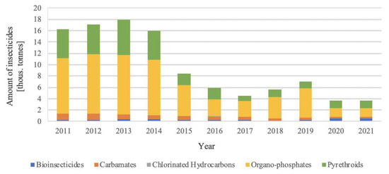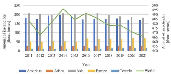 Amount of insecticide used in the agricultural sector worldwide (https://www.fao.org/faostat/en/#data/RP, accessed on 15 September 2023).