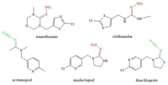 The active substances can be classified into two main groups: nitroguanidine and cyanoamide (Figure 3). The neonicotinoids belonging to the first group have N-nitro groups in their chemical structures, which contain oxygen atoms and make the molecules much more polar. In the molecules of cyanoamide neonicotinoids, on the other hand, there are cyanoamide groups instead of nitro groups, which do not contain oxygen and are thus much less polar and reactive [18,19]. The chemical structure of the compounds in the two groups mentioned above determines their susceptibility to decomposition in the soil and metabolism in an insect’s body. The biological activity and toxicity of a compound are determined by the type of functional group present in the molecule and its spatial arrangement relative to other substituents.
