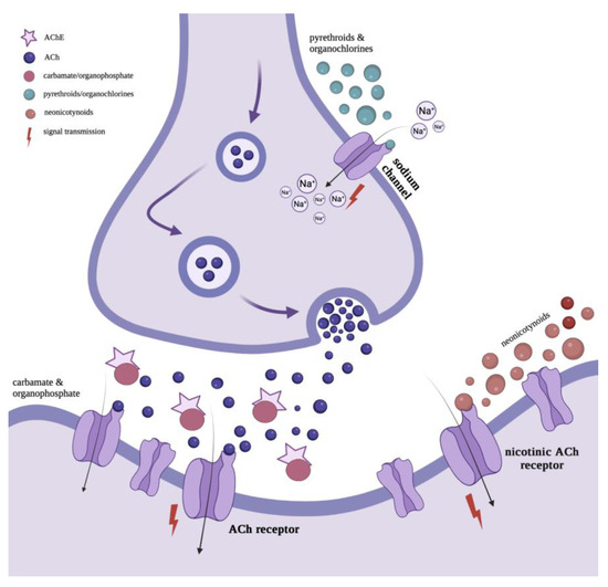 Organochlorine insecticides are a group of neurotoxic poisons that can easily penetrate through an insect’s epidermis due to their lipophilic nature. They exert both central and peripheral neurotoxic effects by interfering with the movement of sodium ions in the sodium channels of axons. This causes the ions to leak through the nerve membrane and create a destabilizing negative ‘secondary potential’, resulting in repeated discharges in the neuron—the so-called ‘knock-down’ effect (Figure 4). Insects die as a result of the production of endogenous neurotoxin and organism exhaustion [37]. Insecticides that contain chlorinated cyclodienes operate differently. They affect the chloride channels of γ-aminobutyric acid (GABA) receptors, which causes them to open and increases chloride conductance, leading to the inhibition of a new action potential [38].