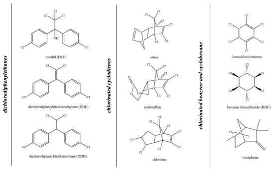 Organochlorine insecticides are a group of plant protection products that consist of aliphatic or aromatic hydrocarbons substituted with chlorine atoms. They are divided into three basic groups: dichlorodiphenyl ethanes, cyclodienes, and chlorinated benzenes and cyclohexanes (Figure 5) [29].