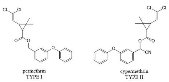 Pyrethroids are characterized by a selectivity of action that is unparalleled in other insecticide groups as well as high pest-killing activity with significantly low toxicity toward humans and other higher organisms. These features have gained them a lot of interest and made them among the most widely used insecticides in the world. Their structure resembles naturally occurring pyrethrins extracted from chrysanthemum flowers (Chrysanthemum cinerariaefolium) [50]. Synthetic pyrethroids are esters of chrysanthemic acid and alcohols of various structures. Usually, they are a racemic mixture of stereoisomers. Due to their chemical structure and mode of action, we can divide them into two groups (Figure 8): type I pyrethroids, which have cyclopropanecarboxyl in their structure and cause hyperactivity and deterioration of an insect’s coordination, as well as type II pyrethroids, containing an α-cyano group. The latter group potentiates their insecticidal effect because it induces depolarization of the nerve, thus causing the paralysis of an individual [51,52,53].