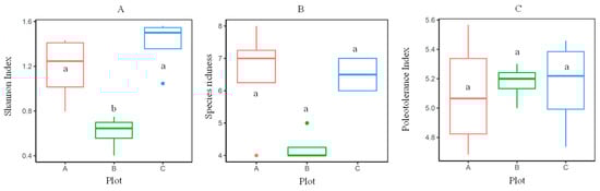 Shannon index (A), species richness (B), and poleotolerance index (C) of the ELs in study plots. Letters represent a significant difference among the plots (A, B, and C) at p < 0.05 according to the Kruskal–Wallis comparisons of the means analysis and the pairwise comparisons using the Wilcoxon rank sum test.