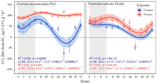 Diel CO2 fluxes (the average of three biological replicates during three diel series of measurements ± SE) by the ELs of two species (Evernia mesomorpha Nyl. and Parmelia sulcata Taylor) of various exposures on the tree stems incubated at a controlled photoperiod and thermal regime. The negative values reflect CO2-photoassimilation; the positive values reflect dark respiration. The gray-shaded rectangular area shows the night period without illumination. Shaded areas represent the 95% confidence interval associated with each polynomial curve.