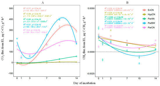 Daytime CO2 (A) and CH4 (B) fluxes (mean ± SE) by the EL species (Evernia mesomorpha Nyl., Parmelia sulcata Taylor, and Hypogimnia physodes (L.) Nyl.) of various exposures on the tree stems incubated at a controlled photoperiod and thermal regime. The negative values reflect photoassimilation and the positive values reflect respiration. EvCN is Evernia of a northern exposure from the C plot; HypCN is Hypogimnia of a northern exposure from the C plot; ParAN is Parmelia of a northern exposure from the A plot; ParBW is Parmelia of a western exposure from the B plot; ParCN is Parmelia of a northern exposure from the C plot. Shaded areas represent the 95% confidence interval associated with each polynomial curve.