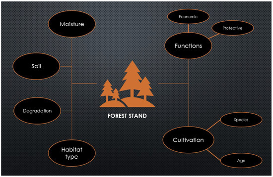 The data used in this analysis were sourced from the Forest Data Bank, which is regularly updated on an annual basis through in situ forest inventory conducted by forestry authorities [19]. Each record within the dataset describes an individual forest stand, defined in forestry as a homogenous forest area characterized by economically significant features, necessitating uniform management practices. The typical area of these individual forest stands ranges from one to several hectares. The database for the year 2022 covered a total of 3,494,871 records. For further analysis, specific categories of stand parameters were taken into account, including: (1) forest habitat type, (2) soil type on which cultivation occurs, (3) habitat degradation level, (4) moisture regime, (5) economic and protective functions of the stands, and (6) species composition and age structure of the stands (see: Figure 1).