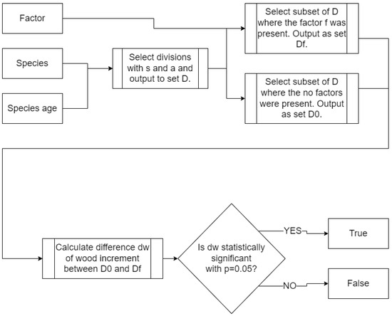 The procedure involved selecting forest stands for each tree species s and each age sa between 20 and 120 years, where the species covered at least 10% of the stand’s area. Subsequently, the dataset of forest stands was divided into two subsets: those with the presence of the factor and those where none of the examined factors occurred. This step was repeated for each of the studied factors. The mean wood volume increment was calculated for both subsets, and a t-Student test was conducted to determine whether the observed difference in means was statistically significant. In cases where the data distribution did not follow a normal distribution, the obtained result was excluded from further analysis, considering it statistically insignificant. This algorithm is illustrated in Figure 2.