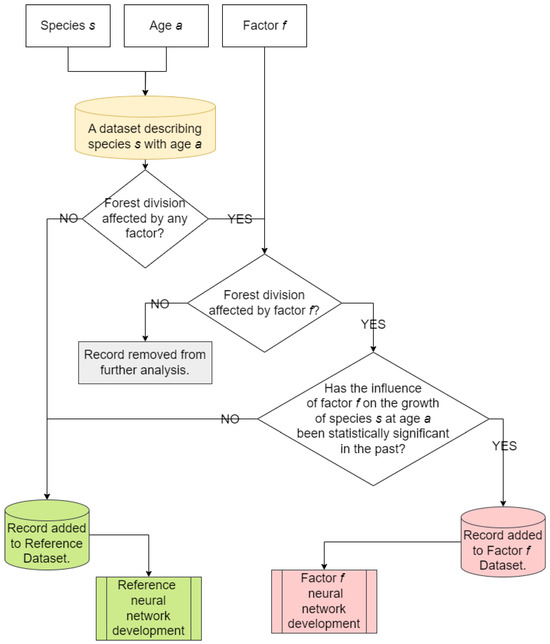 Neural networks are currently used for predicting wood growth increments [21,22]. We developed and used neural network models in simulations. For each species s, the following procedure was performed. From a sample database containing 100,000 records, forest divisions containing species s were selected. This way, the sample database was limited to samples for species s. Then, in order to create a neural network model that predicts increments for divisions without external factors, divisions were selected where either no external factor was present or the external factor was present but did not have a statistically significant impact on the growth of that species at a given age based on historical studies. Using this constructed database, reference models were developed. Next, for each pair of species s–external factor f from the sample for species s, a subset where the factor f occurred was selected. Models were then developed for each s–f pair. This scheme is illustrated in Figure 3.