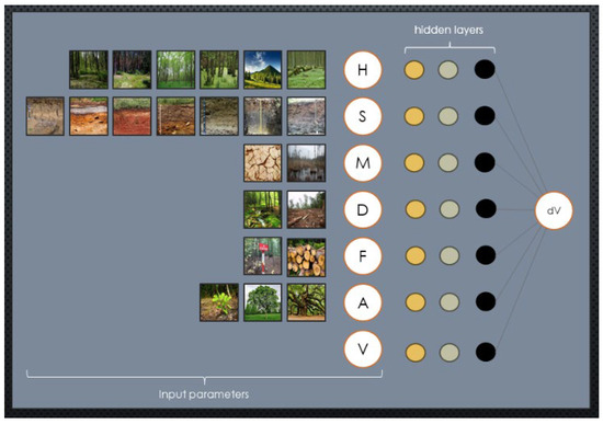 Structure of a neural network model for an individual tree species and for an individual external factor or the absence of such a factor. The input of the neural networks includes information: habitat type (H), soil (S), moisture (M), habitat degradation (D), cultivation functions (F), tree stand age (A), current volume of the species (V). At the output, we obtain the value dV, which represents the volume increment. Input data are derived from forest stands where the studied species is present and where cultivation occurs at an age sensitive to the occurrence of a given factor (or the absence of any factor).