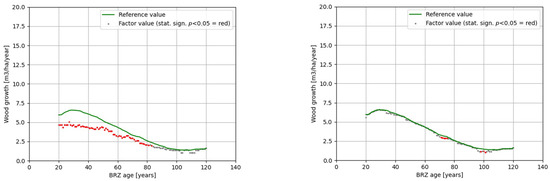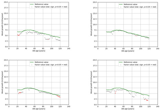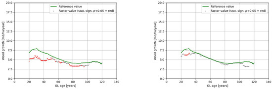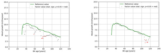 Figure 10 show depict the average annual increments of beech wood volume in a sample of 100,000 forest stands in Poland, as well as the average increments in forest stands affected by external factors: insects and climate. The age of trees, for which the growth differences are statistically significant, has been highlighted.