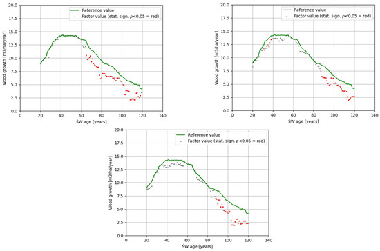 Figure 9 show depict the average annual increments of spruce wood volume in a sample of 100,000 forest stands in Poland, as well as the average increments in forest stands affected by external factors: insects, fungi and climate. The age of trees, for which the growth differences are statistically significant, has been highlighted.