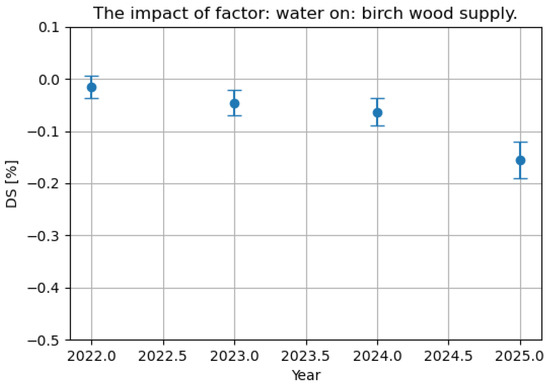 Below, we present the impact of water relations disturbance on birch harvesting volume. It is assumed that the intensity of the factor increased tenfold compared to 2022. Figure 11 presents the results based on a neural network model: during the period of 2023–2025, the harvesting volume diminishes, reaching a decline of nearly 0.2% in 2025 compared to the scenario without the occurrence of this factor.