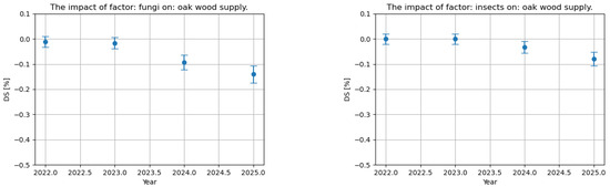 Below, we present the impact of fungi and insects on oak harvesting volume. It is assumed that the intensity of these factors increased tenfold compared to 2022. Figure 12 presents the results based on a neural network model: during the period of 2023–2025, fungi caused a decline in harvesting volume, especially in 2024–2025, with a decrease exceeding 0.1%. In contrast, insects led to a decrease in harvesting volume by less than 0.1% in 2024–2025 compared to the scenario without the occurrence of these factors.