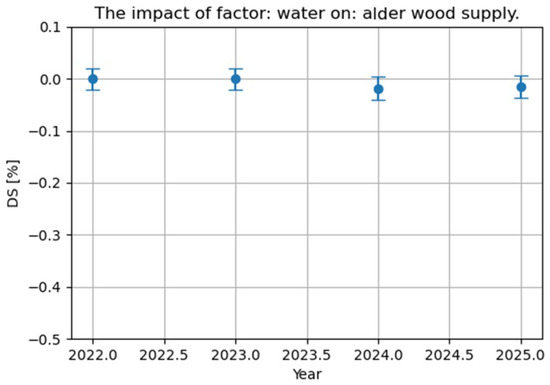 The impact of water-related factors on alder harvesting volume is less significant. Figure 13 presents the results based on a neural network model: during the period of 2023–2025, water-related factors caused a decrease in harvesting volume, with the decline staying below 0.05% for each year compared to the scenario without the occurrence of these factors.