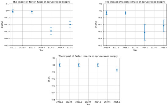 The impact of fungi, climate, and insects on the harvesting volume of spruce is the most significant. It is assumed that the intensity of these factors increased tenfold compared to 2022. Figure 15 presents the results based on a neural network model: during the period of 2023–2025, both fungi and climate-related factors contribute to the highest decrease in harvesting volume among the studied species, reaching above 0.2%. In 2024, it amounts to 0.3% for both fungi and climate-related factors. The influence of insects on harvesting volume is most pronounced in 2025, with a decrease exceeding 0.05%.