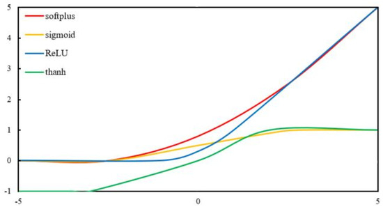 - Convolutional layer: Five convolutional layers are used in this study. The convolutional layer is the most important part of the entire network, and its core is the convolutional kernel (or filter). Convolutions have two attributes, size and depth, that can be set manually. As the sample size in this article is self-established and small, it is not suitable to adopt a high depth to prevent overfitting. Convolution reduces the dimensionality while extracting images. Convolutional layers are used to extract image features at a deeper level. After completing the convolution, functions are used to correct the results. Commonly used correction functions include sigmoid, rectified linear unit (ReLu), softplus, and tanh. Their function images are shown below:
