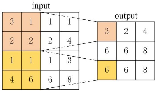 - Pooling layer: The pooling layer is usually followed by the convolutional layer; it is used to reduce the size of the matrix, preserve the main features while reducing the parameters of the next layer, and reduce the computational complexity to prevent overfitting. Max pooling and average pooling methods are used often. For image recognition, the max pooling method can reduce the mean shift caused by convolutional layer parameter errors. It can retain more texture information, which is also important in image processing. The principle is shown in Figure 4.