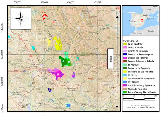 Data samples were collected in the “Serranía de Cuenca” mountain range (central Spain), which is located in the southern Iberian System, with a length of approximately 100 km. In the Serranía de Cuenca, 15 public forests that belong to the regional administration (i.e., 15 experimental areas) were selected following a latitudinal gradient of about 95 km, with altitudes ranging between 1002 and 1418 m.a.s.l., to achieve a representative sample (Figure 1; Table 1).