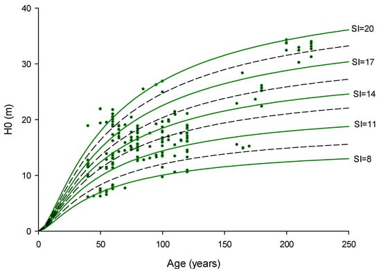 Sampling plots projected onto the site quality curves explained by Loranca [32] to obtain the site index (SI) for each plot as a function of H0 and the stand age (n = 180 plots). The guide curve has the following parameters: a = 5.22, and b = 0.19. Five site indexes (SI) were established, corresponding to 8, 11, 14, 17, and 20 m at the reference age of 60 years. Plots where the dominant height exceeds the family of curves were assigned as having the best site quality.