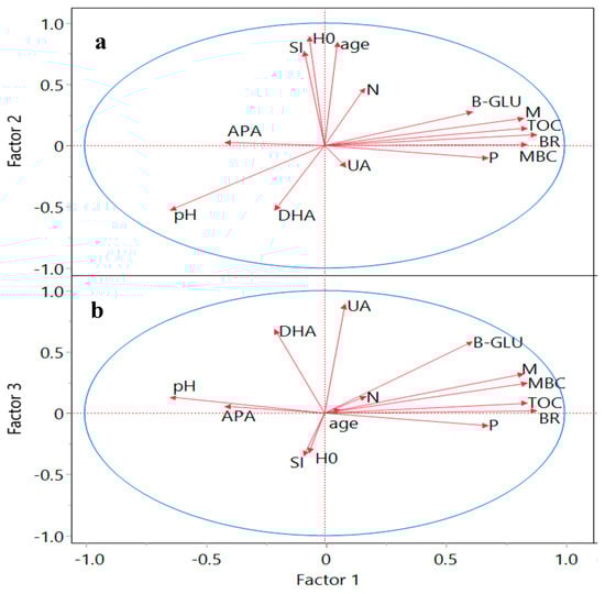 Projection of variables (vectors marked with lines) on the factor plane as a combination of Factors 1, 2 (a), and Factors 1, 3 (b) extracted by principal components and varimax rotation. The two-dimensional factor plot (biplot) represents the weight of loadings for each chosen factor. Reference lines are drawn at 0.0 in each dimension, and a weight close to 0.0 indicates that the variable contributes little to the factor. H0: dominant height (m); SI: site index (m); B-GLU: β-glucosidase (µmol PNF g−1 h−1): UA: urease (µmol N-NH4 g−1 h−1); DHA: dehydrogenase (µmol INTF g−1 h−1); APA: alkaline phosphatase (µmol PNF g−1 h−1); BR: basal respiration (µg C-CO2 g−1 day−1); MBC: microbial biomass C (µg C g−1); TOC: total organic C (mg C g−1); N: total nitrogen (%); P: available phosphorous (mg kg−1); pH: acidity; M: soil moisture (%).