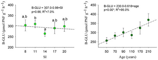 Figure 4 reflects that the soil sampled in stands with an inferior site quality (SI = 8) showed greater enzymatic activity (UA, DHA) than the soil from the other forest stands. Significant variability was also observed among the analyzed age classes. Middle-aged and older stands had a significantly lower DHA, despite the higher B-GLU values of the 210-year class. The highest value of DHA and UA was noted for the 50-year class.