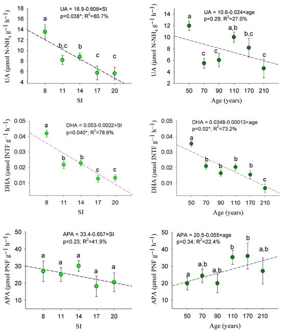 Mean values of enzymatic soil activity within the site indexes and age classes: mean values with the same letter do not differ at the 0.05 level according to the LSD test. Sample data = 180 plots. Error bars: standard errors. For each soil variable, patterns as functions of site quality and age are also included. H0: dominant height (m); SI: site index (m); B-GLU: β-glucosidase (µmol PNF g−1 h−1): UA: urease (µmol N-NH4+ g−1 h−1); DHA: dehydrogenase (µmol INTF g−1 h−1); APA: alkaline phosphatase (µmol PNF g−1 h−1). *: signifies a significant regression (p < 0.05).