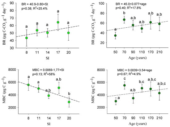 Mean values of microbiological properties within age classes and site index categories: mean values with the same letter do not differ at 0.05 level according to LSD test. Sample data = 180 plots. Error bars: standard errors. For each soil variable, patterns as functions of site quality and age are also included. BR: basal respiration (µg C-CO2 g−1 day−1); MBC: microbial biomass C (µg C g−1).