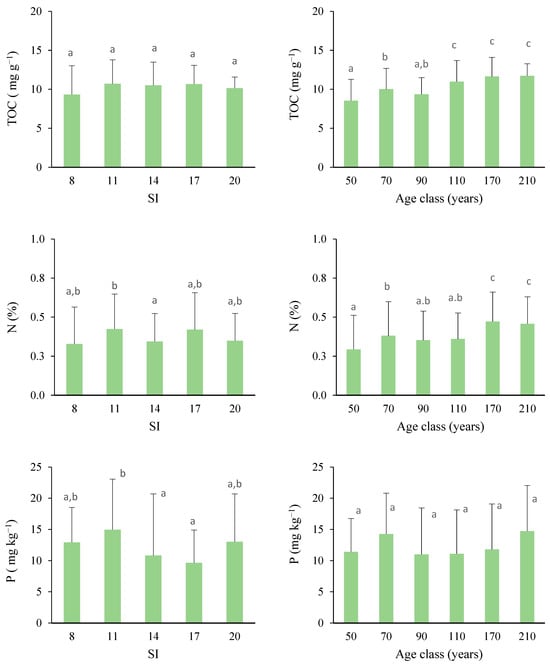 Variations in total organic C (TOC; mg C g−1), total N (Kjeldahl; %), and available P (mg kg−1) depending on the site quality and age class. Bars represent the standard errors. Mean values with the same letter do not differ at the 0.05 level according to the LSD test. Sample data = 180.
