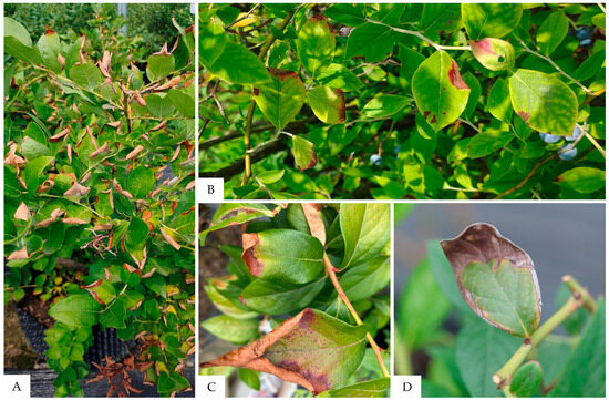 - Lai, J.; Liu, B.; Xiong, G.; Liu, T.; You, J.; Jiang, J. First Report of Diaporthe phoenicicola Causing Leaf Spot on Blueberry (Vaccinium virgatum) in China. Plant Dis. 2023, 107, 569. [Google Scholar] [CrossRef] [PubMed]