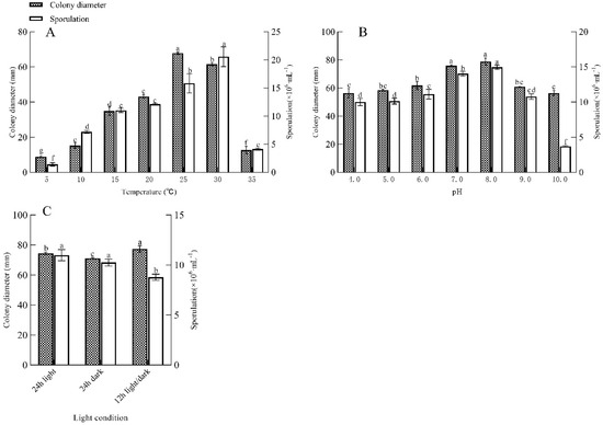 3.5.1. Effects on Growth and Sporulation of C. aenigma at Different Temperatures, pH, and Light
