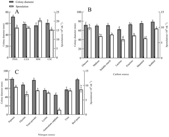 3.5.2. Effects of Different Culture Media and Carbon and Nitrogen Sources on Mycelial Growth and Spore Production