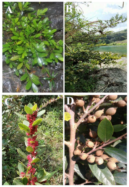 D. chinense (Figure 1A–D) is a perennial shrub of the Distylium genus of the Hamamelidaceae family. Adventitious branches from deep-seated rhizomes generate dense colonies. It can reach a height of 0.8 to 1.2 m and has a large root system. Leaf blade is elliptic to oblanceolate, 2–4 cm long, 1–1.2 cm wide, both surfaces glabrous, base broadly cuneate, margin entire or with two or three teeth on each side near apex, apex subacute; lateral veins five per side, reticulate veins obscure on both surfaces; petiole is densely lepidote and 1.5–2 mm long; lateral veins five per side. It germinates seeds in the autumn and blooms in the early spring [30]. D. chinense of the population is a perennial shrub with adventitious branches that emerge from deep-seated rhizomes to produce dense colonies. It has a well-developed root system and is considered an ideal protective shrub species along riparian areas [30].