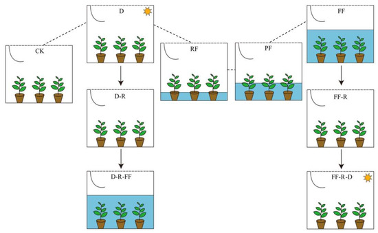 Experimental design drawing. The treatments of D, RF, FF, and PF were the single stress each for 28 days: CK (control), D (drought), RF (root flooded), FF (fully flooded), PF (partially flooded); D-R (drought recovery) and FF-R (flooding recovery) were 2 weeks recovery period; D-R-FF and FF-R-D were alternate drought and flooding stresses for 2 weeks respectively.