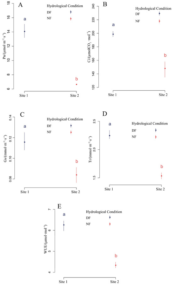 Effects of drought–flooding condition (DF) and no any flooding condition (NF) on photosynthetic characteristics of D. chinense. Values are means ± SE, n = 3. Various lower-case letters indicate statistically significant variations (p < 0.05). Photosynthetic parameters were measured from population distribution sites in Three Gorges Reservoir area, China. The habitat of D. chinense on Site 1 is drought–flooding (DF) condition, Site 2 is no flooding (NF) condition. (A) Pn “net photosynthetic rate”; (B) Ci “intercellular CO2 concentration”; (C) Gs “stomatal conductance”; (D) Tr “transpiration rate”; (E) WUE “water-use efficiency”.