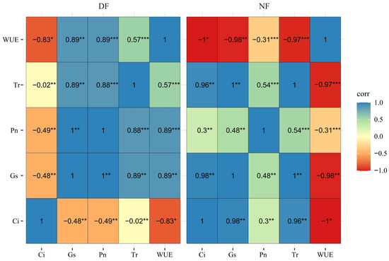 Correlation of drought–flooding condition (DF) and no any flooding condition (NF) on photosynthetic parameters of D. chinense. Pn “net photosynthetic rate”; Gs “stomatal conductance”; Ci “intercellular CO2 concentration”; Tr “transpiration rate”; WUE “water-use efficiency” (“***” p < 0.001, “**” p < 0.01, “*” p < 0.05).