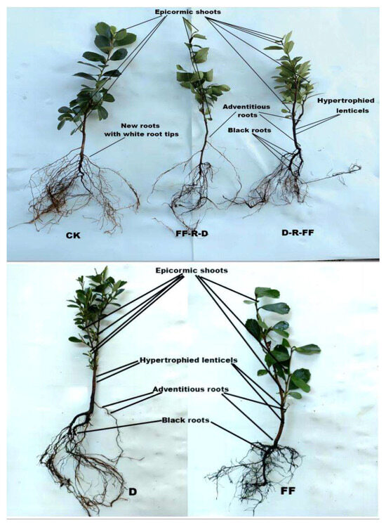 In relation to its morphology under single-stress treatments, a slight increase (FF > D > CK) in stem diameter was accompanied by the development of hypertrophied lenticels (D > FF > CK) at the stem base (Table 3). The primary roots of all flooded seedlings became black, some of which even decayed to death with prolonged flooding. And adventitious roots and stem lenticels occurred significantly in the FF seedlings with prolonged flooding. However, all the flooded seedlings’ stem lenticels vanished shortly after soil draining (recovery). Similarly, adventitious roots and stem lenticels of drought seedlings occurred significantly compared with fully flooded seedlings (D > FF). In addition, more hypertrophied lenticels and adventitious roots occurred significantly in the D-R-FF treatment, compared with CK, FF, and FF-R-D (Table 3; Figure 6). The roots of the drowned seedlings in the D-R-FF of roots became black, and the blades of the FF-R-D shrank (Figure 6).