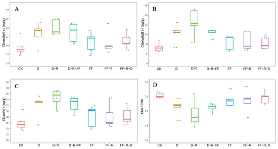 Our findings revealed that the content of Chl a, Chl b, and Chl (a + b) in the D-R-FF was significantly higher than FF and alternating FF-R-D (Figure 7). And multiple abiotic regimes had substantial impacts on leaf Chl a (Figure 7A), Chl b (Figure 7B), Chl (a + b) (Figure 7C), and their ratio (Chl a/Chl b) (Figure 7D). The content of Chl a in the FF-R was 15.14% less than that in the D-R (Figure 7A). And the content of Chl b in the FF-R was 32.07% less than that in the D-R (Figure 7B). The content of Chl a in the FF-R-D was 8.45% less than that in the D-R-FF (Figure 7A). And the content of Chl b in the FF-R-D was 20.15% less than that in the D-R-FF (Figure 7B). It was obvious that the content of Chl a, Chl b, and Chl (a + b) in the D-R-FF was higher than that in the FF-R-D (Figure 7A–C), while Chl a/Chl b content was 13.56% less than that in the FF-R-D (Figure 7D).