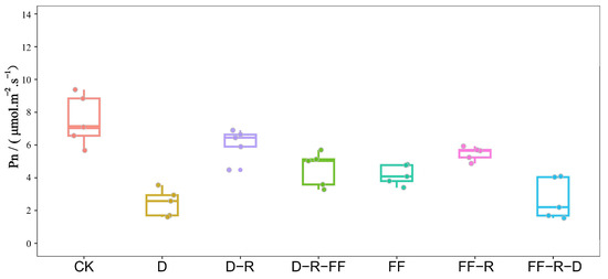 Seven different treatments on net photosynthetic rate (Pn) with D. chinense seedlings presented. CK (control); D (drought); FF (fully flooded); D-R (drought-recovery) and FF-R (flooding-recovery); D-R-FF (from drought to recovery to full flooding) and FF-R-D (from full flooding to recovery to drought). The central line in the box plots represents the median value. The lower and upper box limits correspond to the net photosynthetic rate threshold.