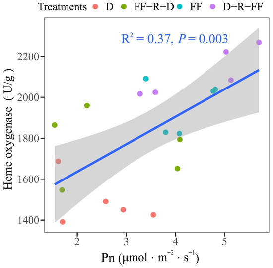 Linear regression analysis showed that the relationship between those hydrological regimes (D, FF-R-D, FF, D-R-FF) of Pn and HO was positively significant (r = 0.608, p = 0.003) (Figure 9). The increase in Pn was due to the increased heme degradation by HO. Pn in the D-R-FF exerted a relatively higher photosynthetic rate than in FF, followed by FF-R-D and D (D-R-FF > FF > FF-R-D > D), which was consistent with the degradation trend of each hydrological regime of heme by HO (D-R-FF > FF > FF-R-D > D).