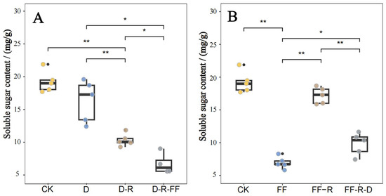 The soluble sugar content of D. chinense leaves. (A) An alternate stress pathway: from drought to recovery to full flooding. (B) Another alternate stress pathway: from full flooding to recovery to drought. CK (control), D (drought), FF (fully flooded), D-R (drought-recovery), FF-R (flooding-recovery), and two types of alternate drought and flooding stresses of D-R-FF and FF-R-D are also presented. Single stress with drought and flooding each for 28 days. The colored dots indicate different soluble sugar content. The median line in box plots represents the median value. A threshold is represented by the box’s lower and upper boundaries. Significant differences in the average soluble sugar are indicated by an asterisk (*). (Tukey’s HSD test, “**” p < 0.01, “*” p < 0.05).
