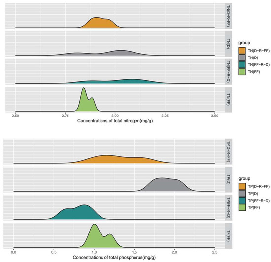 Soil concentrations of total nitrogen (TN) and total phosphorus (TP) in single and alternate stresses of drought and flooding (D, FF, D-R-FF, FF-R-D). The x-axis is defined as the concentration of TN and TP (mg/g).