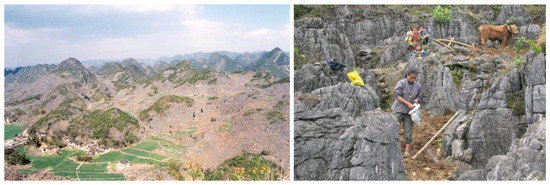 Left is a fragile karst desertification (KD) landscape and right is agricultural production in KD areas.