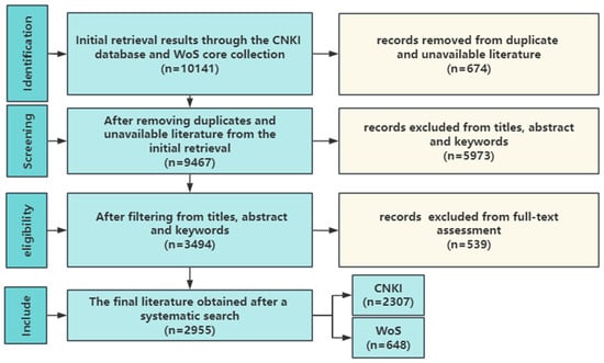 We used inclusion and exclusion criteria to select research related to this review based on the initial search results (Figure 2). Inclusion criteria are as follows: (1) the search term should exist at least in the title, abstract, and keywords of the study; (2) studies in CNKI and WoS databases; (3) retrieve studies based on KD research in the literature; (4) studies in English or Chinese; (5) the types of studies include journal articles and reviews, conference papers, books, Ph.D. dissertations, and master’s theses; (6) studies published between 1 January 1995 and 30 June 2023. Exclusion criteria include (1) duplicates in the literature; (2) non-KD primary research studies; (3) unavailable literature; and (4) studies of low relevance to KD research. The specific methodology is based on the following screening criteria: