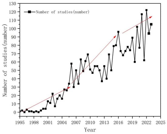 From 1995 to 2005, there was a slow and steady increase in the number of publications with accumulation, especially before 2000, when the number was very small. From 2006 to 2015, there was a fast, fluctuating increase in the number of studies with development. From 2016 to 30 June 2023, there was a steady sharp increase in the number of studies with extension. In 2022, the number reached its peak, with a study volume of 216 (Figure 3). The increasing literature suggests that the field of KD research is burgeoning, and the literature will expand further in the future.