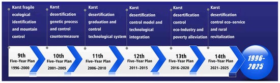 According to the international state of karst forest ecology and the national strategies and local needs of China, the Five-Year Plan for national economic and social development of the People’s Republic of China and the National Science and Technology Plans have led the research trend of KD (Figure 4). From 1995 to 2005, there was a period of accumulation during which the exploration and publication of research subjects on KD were slowly increasing. One special subject on stone mountains has been set up in the Topic Project of the Key Science and Technology Tackling Program in the National 9th Five-Year Plan of China. During this stage, researchers were influenced by the policy and began to explore the theory of KD, which laid the foundation for the subsequent scientific definition of KD and the development of KD control strategies [11,16,19,20]. The current scale of the literature began to manifest itself after 2000. Two karst desertification topics were first set up in the Major Project of the Key Science and Technology Tackling Program in the National 10th Five-Year Plan of China to explore the theory, influencing factors, and control methods of KD. On the basis of research and improvement of basic theories, researchers have published studies on the driving and genetic mechanisms of KD, the application of monitoring technology, and experimental demonstration [9,10,64,65]. These results have guided KD control in Southwest China, and the topic has achieved initial results.